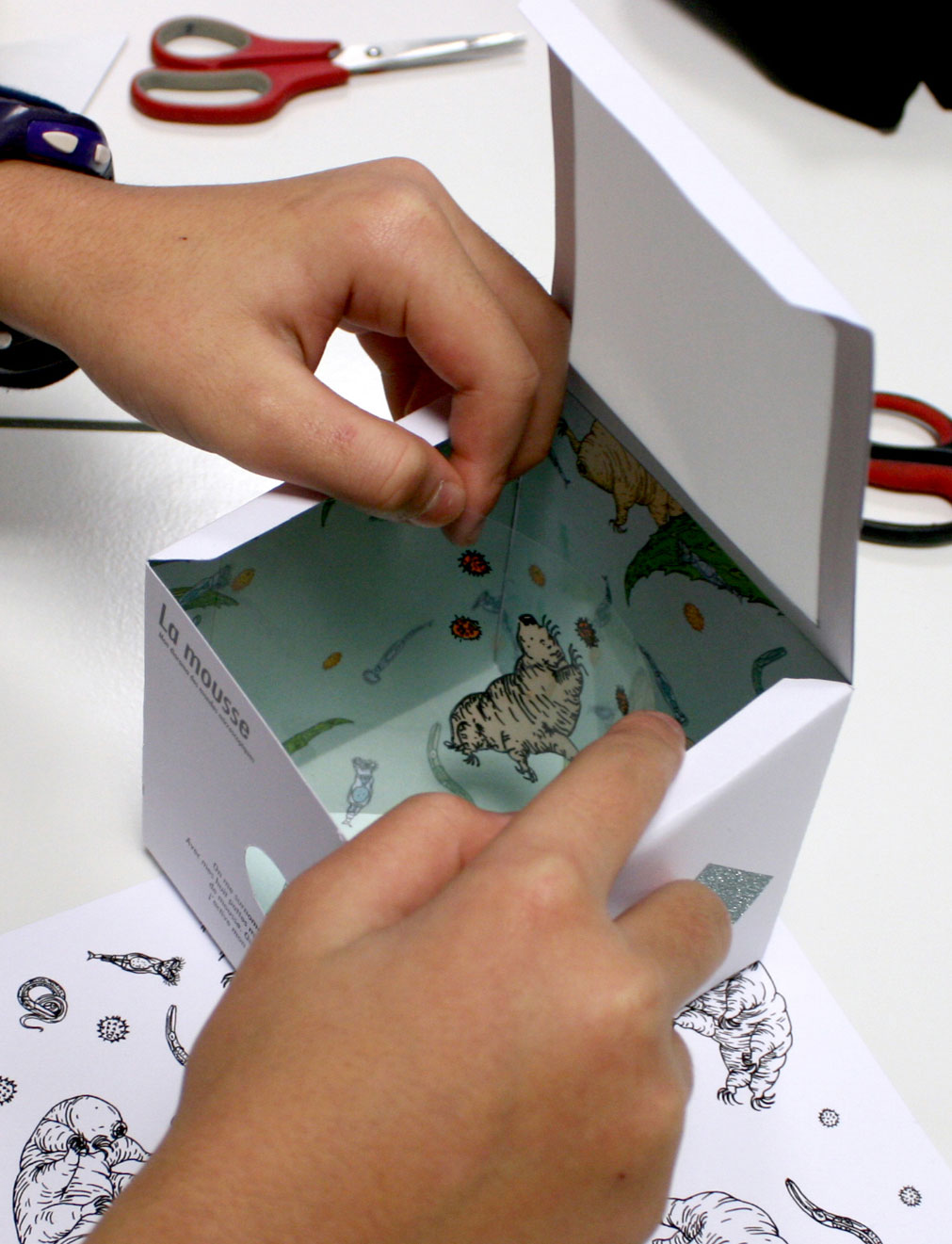 Le livre Les mondes invisibles des animaux microscopiques est une découverte des micro-écosystèmes qui nous entourent et de la diversité des animaux qui les peuplent. Voyage au cœur des mondes microscopiques rejoue cette exploration à travers 2 ateliers et une exposition. Nous proposons tout d’abord la réalisation d’un diorama, une boite mettant en scène un animal microscopique dans son environnement. Puis dans le deuxième atelier, les participants pourront révéler ce qui se cache dans les poussières du sol par l’intermédiaire de la création de grandes fresques collectives. Ici la construction des images s’élaborent au fil des scénarios qui s’écrivent : une promenade sur des cheveux, une escalade sur des grains de sel, un festin dans une goutte de confiture, ou encore la fuite face à l’attaque d’un pseudo-scorpion géant.