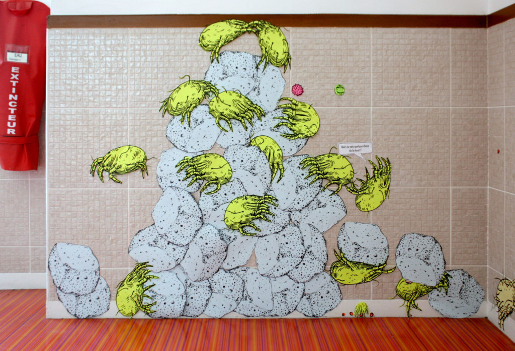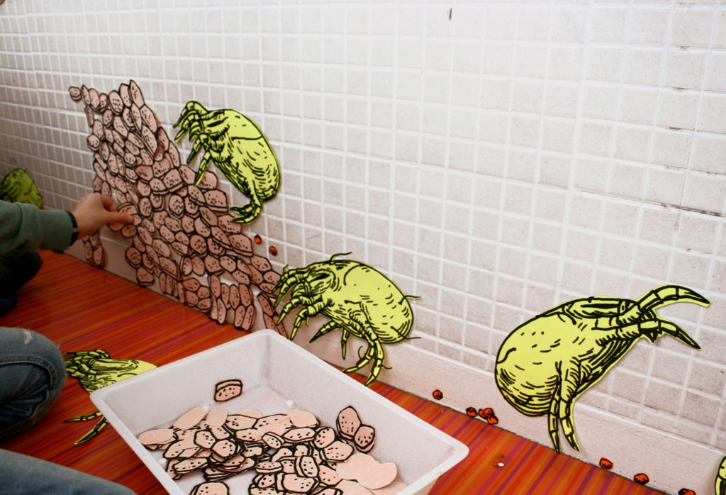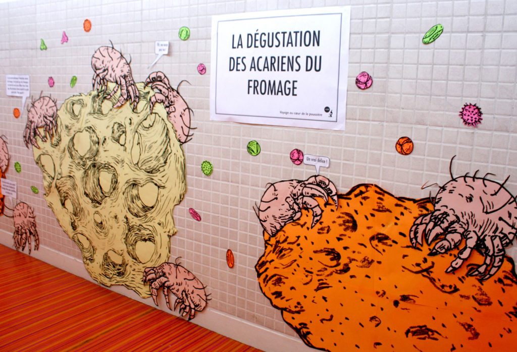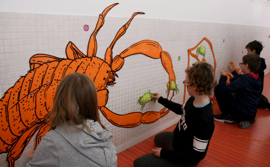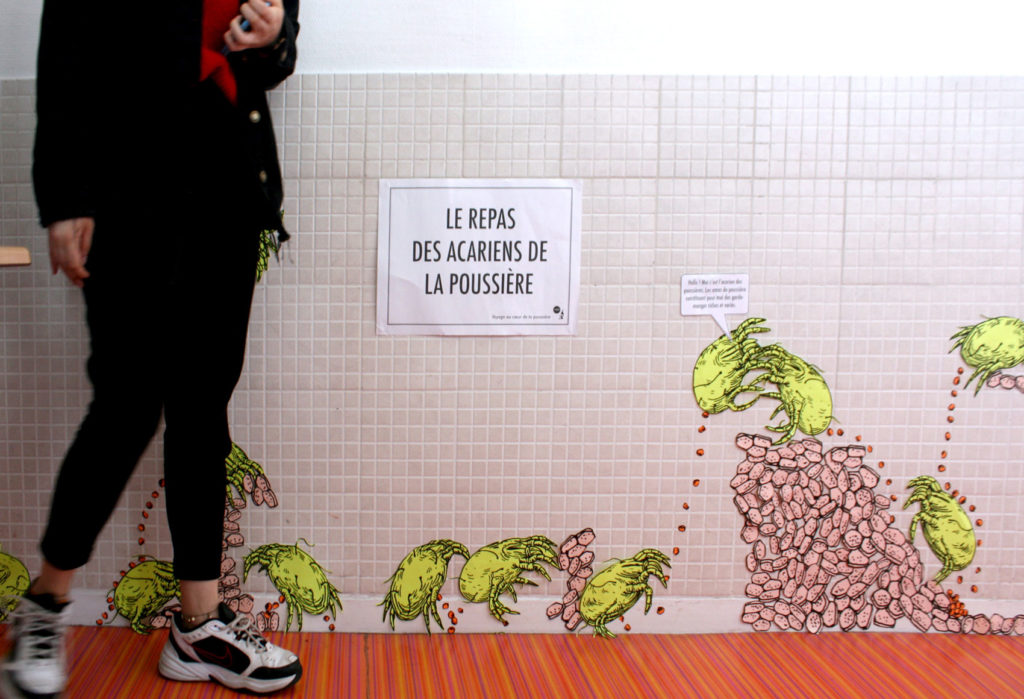 Le livre Les mondes invisibles des animaux microscopiques est une découverte des micro-écosystèmes qui nous entourent et de la diversité des animaux qui les peuplent. Voyage au cœur des mondes microscopiques rejoue cette exploration à travers 2 ateliers et une exposition. Nous proposons tout d’abord la réalisation d’un diorama, une boite mettant en scène un animal microscopique dans son environnement. Puis dans le deuxième atelier, les participants pourront révéler ce qui se cache dans les poussières du sol par l’intermédiaire de la création de grandes fresques collectives. Ici la construction des images s’élaborent au fil des scénarios qui s’écrivent : une promenade sur des cheveux, une escalade sur des grains de sel, un festin dans une goutte de confiture, ou encore la fuite face à l’attaque d’un pseudo-scorpion géant.